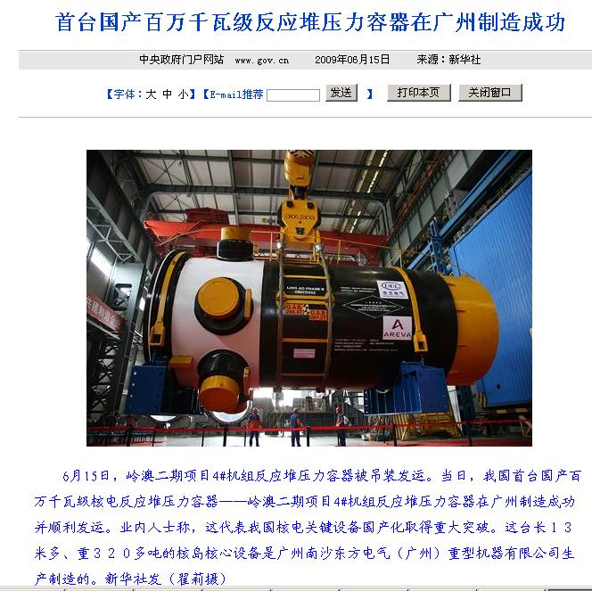 2009年6月15日,我國首臺國產(chǎn)百萬千瓦級核電反應(yīng)堆壓力容器——嶺澳二期項(xiàng)目4#機(jī)組反應(yīng)堆壓力容器在廣州制造成功并順利發(fā)運(yùn)。由德萊奇起重吊索具(昆山)有限公司生產(chǎn)的DOLECO“多來勁”核電設(shè)備專用吊具,圓滿地完成了這次吊運(yùn)任務(wù)。新華社做了專門報(bào)道。