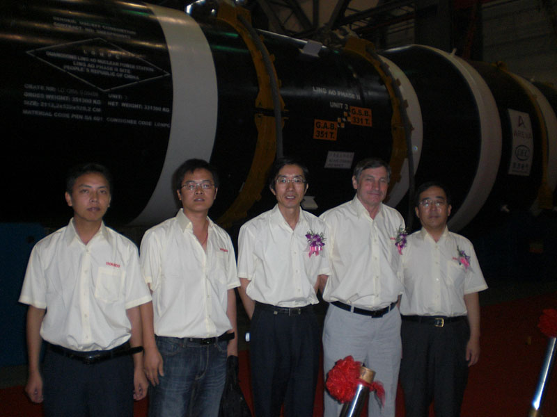 這套設(shè)備是東方電氣(廣州)重型機(jī)器有限公司生產(chǎn)制造的。從2006年9月至2009年6月,東方重機(jī)陸續(xù)完成制造并向嶺澳核電站發(fā)運(yùn)了六臺蒸汽發(fā)生器、兩臺汽水分離再熱器和一臺反應(yīng)堆壓力容器。這些設(shè)備都是使用德萊奇公司提供的DOLECO“多來勁”鋼絲繩、吊裝帶以及吊梁等組合專用吊具吊運(yùn)的。德萊奇集團(tuán)早在幾十年前就開始了與法國阿?,m等核電公司的合作,在核電設(shè)備吊裝方面有多年的經(jīng)驗(yàn),是世界核電吊裝的技術(shù)先導(dǎo)。東方重機(jī)與法國阿?,m(AREVA)幾年來進(jìn)行了成功的技術(shù)合作。